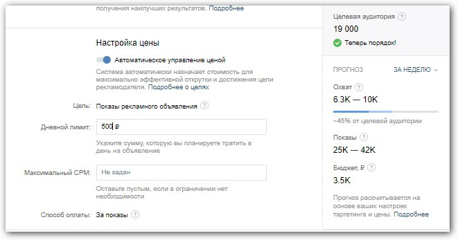 После настройки цены счетчик покажет прогноз показов и примерный бюджет, который нужен для охвата указанной аудитории.